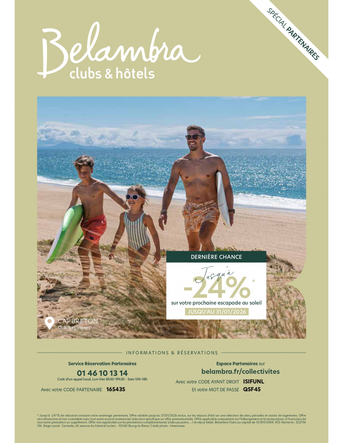 ou par Internet : http://www.belambra.fr/0/partnerLogin.html - Login ISIFUNL - mot de passe QSF45
